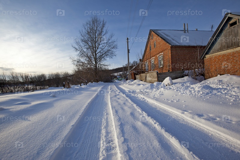 Деревенская улица с дорогой в ясный зимний день после свежевыпавшего снега