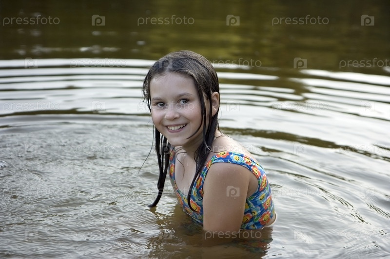 Девочка с мокрыми волосами сидит по пояс в воде и улыбается