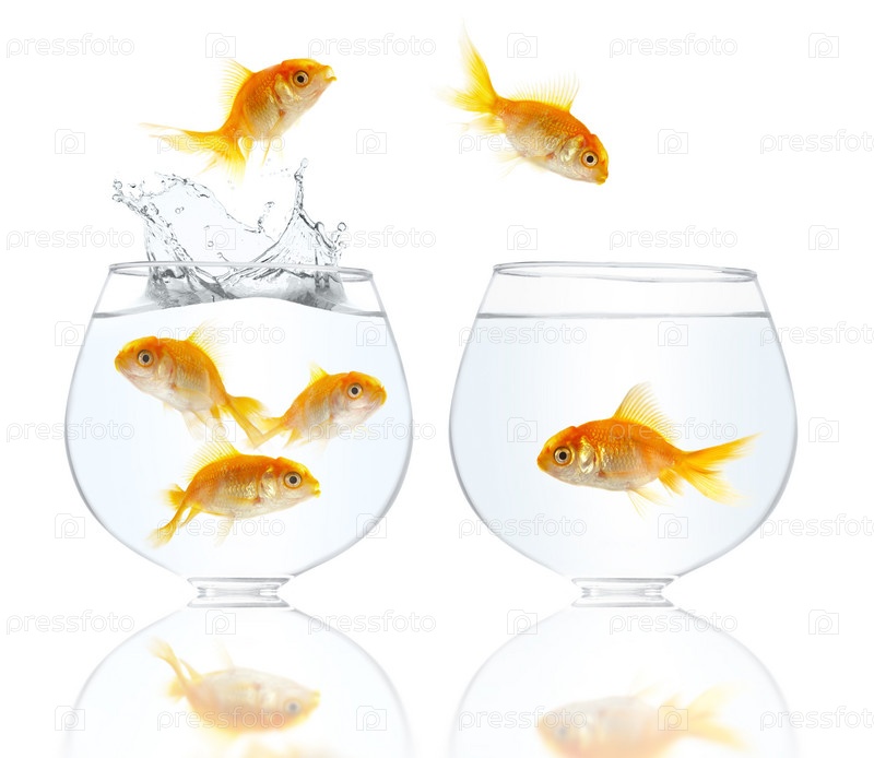 Аквариумы с золотыми рыбками на белом фоне