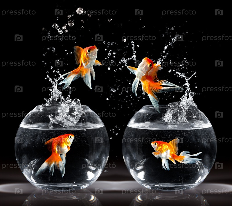 Золотые рыбки выпрыгивают из аквариума, темный фон