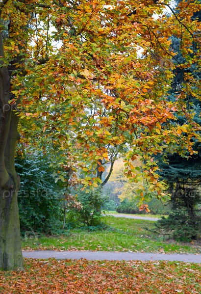Деревья в осеннем парке и пешеходная дорожка. Осенний пейзаж