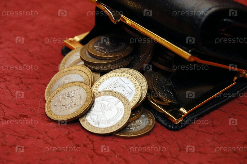Монеты и кошелек на красном фоне