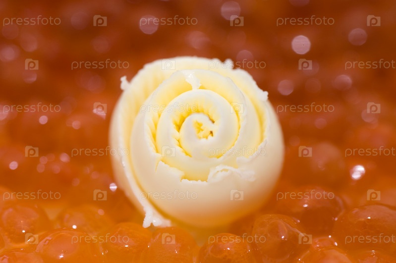 Кусочек сливочного масла на фоне красной икры