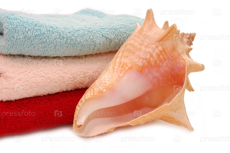Полотенца и ракушка на белом фоне