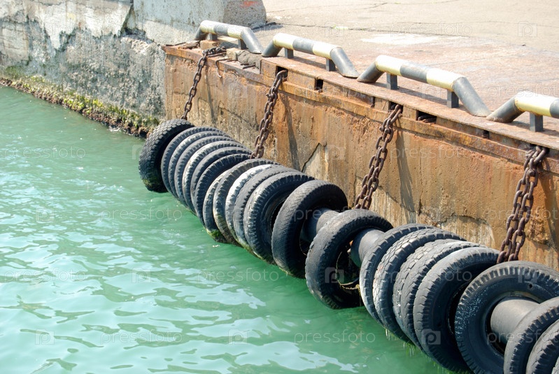 Старые автомобильные шины на цепях у причала