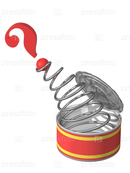Знак вопроса на пружинке, выпрыгивающий из банки