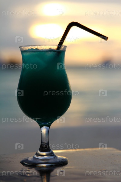 Бирюзовый коктейль со льдом в стеклянном бокале на фоне моря