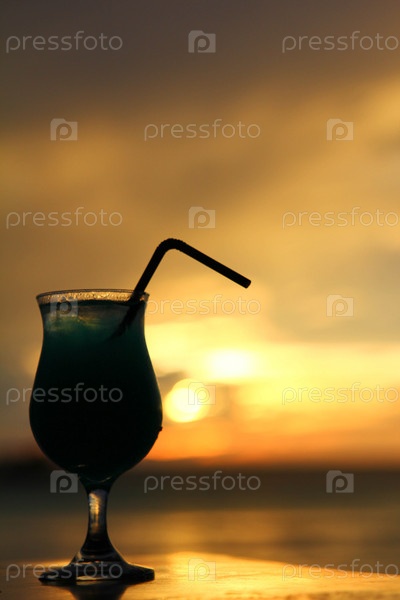 Стеклянный бокал с коктейлем на фоне оранжевого заката