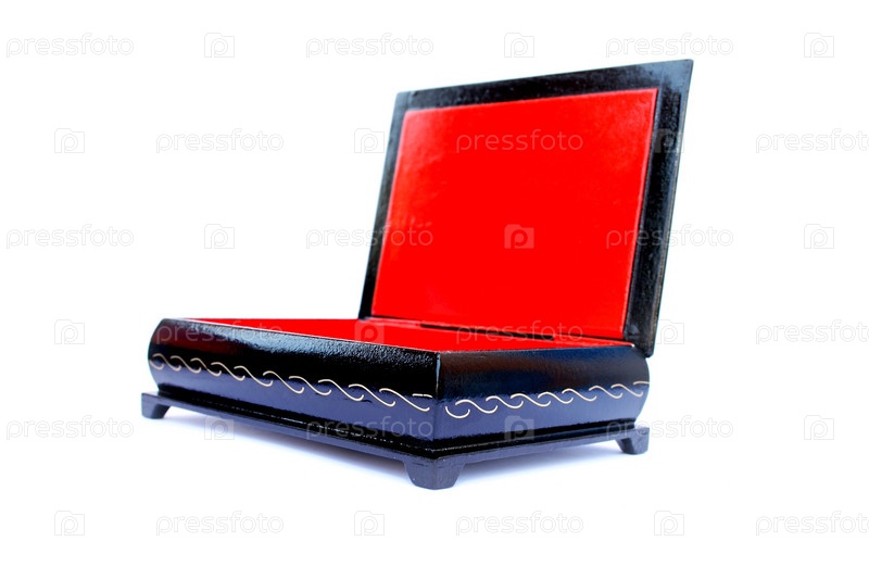 Черная деревянная шкатулка, отделанная внутри красным, изолированная на белом фоне