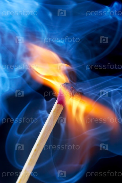 Горящая спичка в дыму на черном фоне