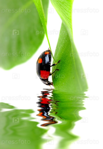 Жук на зеленом листе, отражение в воде