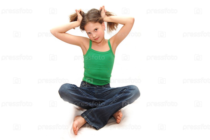 Девочка сидит на полу, подняв кверху волосы