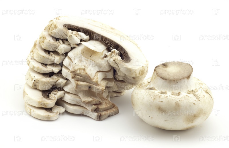 Целый шампиньон и кусочки шампиньона на белом фоне