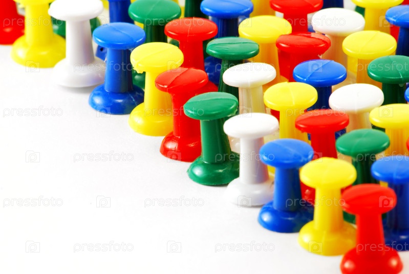 Разноцветные канцелярские кнопки на белом фоне