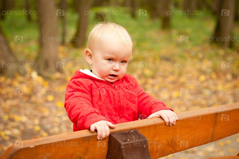 Маленький ребенок стоит на скамейке в парке