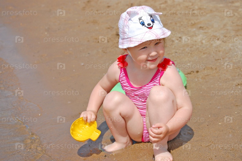 Маленькая девочка, сидящая на мокром песке