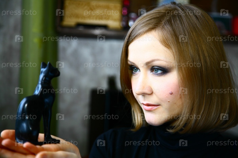 Портрет молодой девушки, которая держит в руках статуэтку в виде кошки