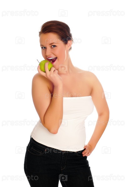 Молодая женщина ест яблоко и улыбается на белом фоне