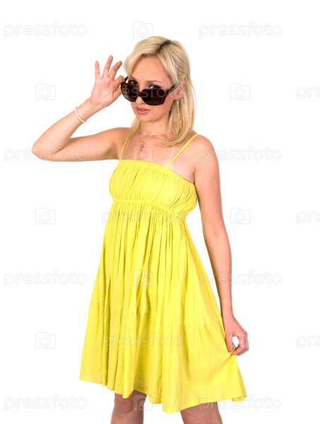 Девушка в желтом летнем платье и в солнцезащитных очках на белом фоне
