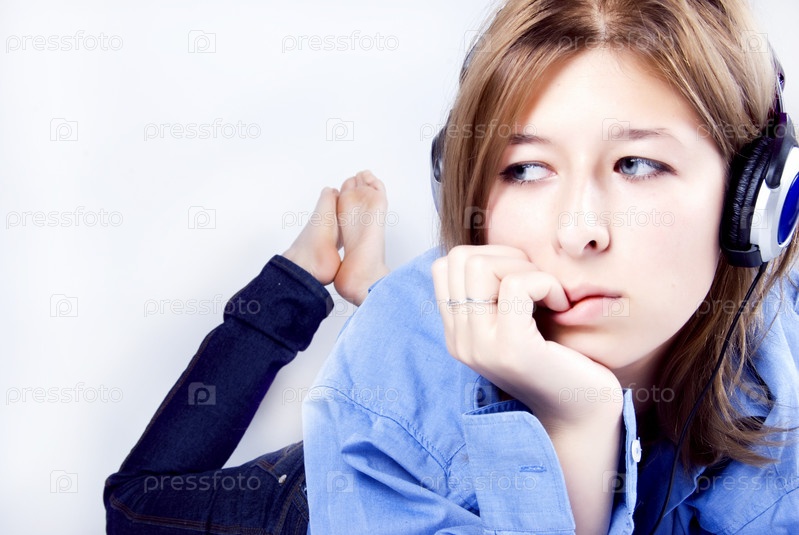 Грустная девушка в наушниках на светлом фоне