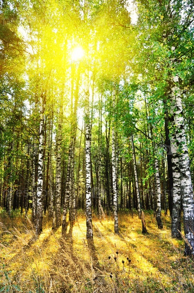 Березовые деревья в летном или осеннем лесу