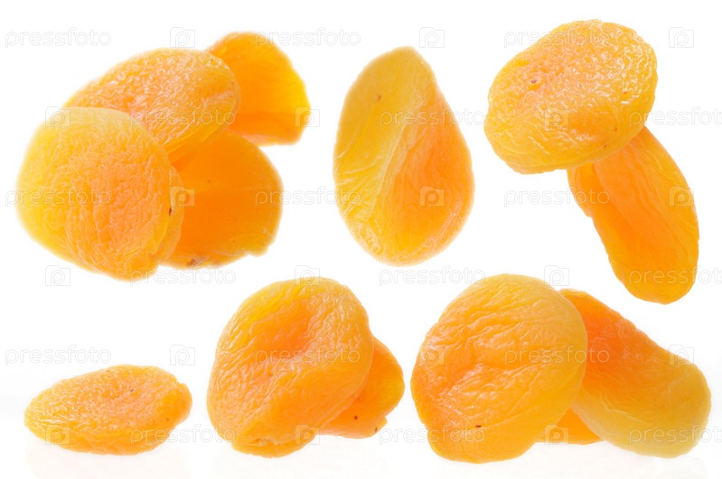 Близкий план нескольких сушеных абрикосов, изолированных на белом