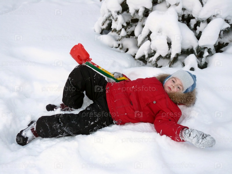 Мальчик в красной куртке зимой лежит на снегу