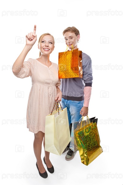 Счастливая женщина и мужчина с бумажными пакетами на белом фоне