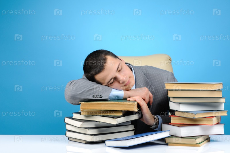 Молодой человек уснул на книгах