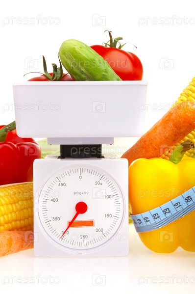 Овощи, весы и сантиметровые ленты на белом фоне