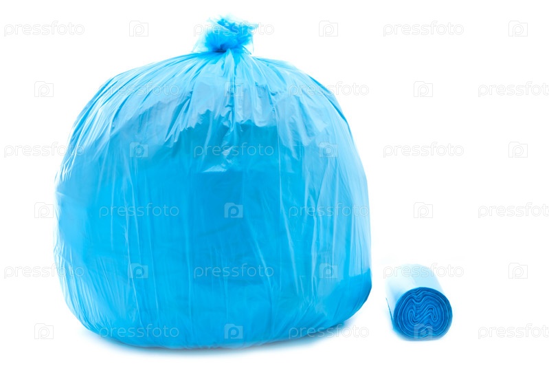 Полный синий мешок для мусора на белом фоне