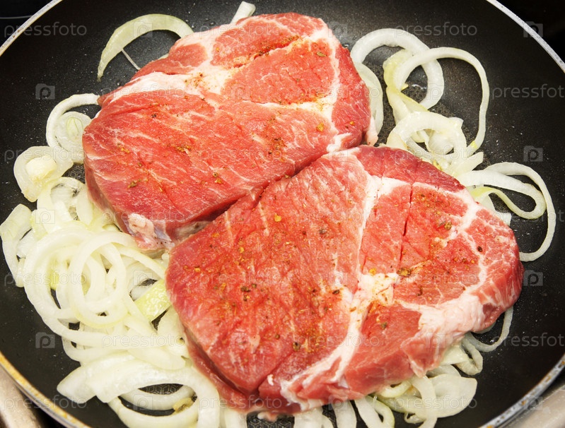 Сырое мясо и лук на сковородке перед жаркой