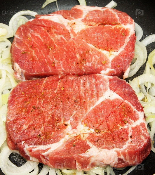 Сырое мясо и лук на сковородке перед жаркой