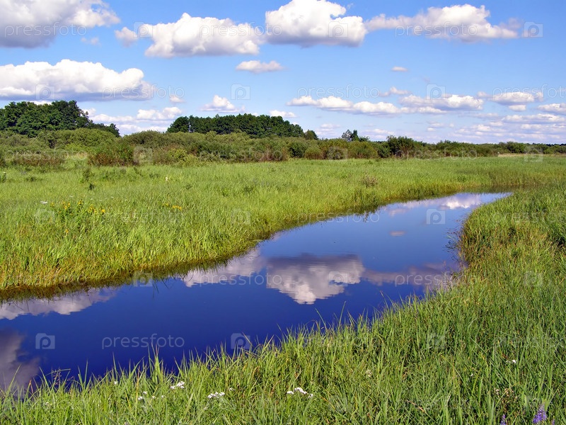 Небольшая голубая река вдоль зеленого поля