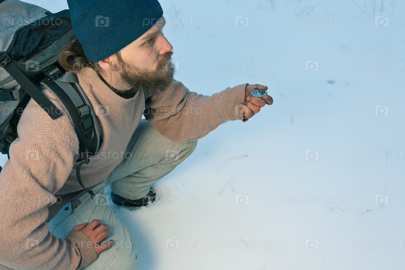 Путешественник с компасом в зимнем лесу
