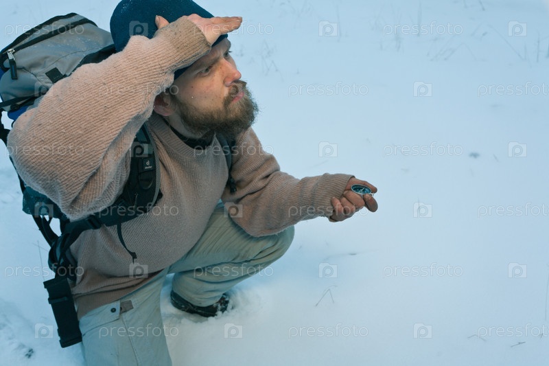 Путешественник с компасом в зимнем лесу