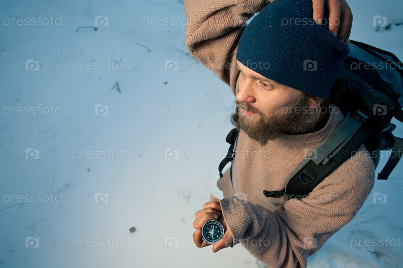 Путешественник с компасом в зимнем лесу