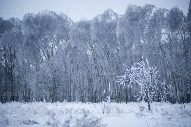 Зимний пейзаж. Деревья в лесу покрыты снегом и льдом после шторма