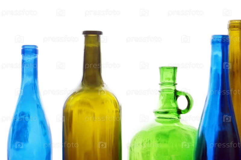 Ряд разных пустых стеклянных бутылок на белом фоне