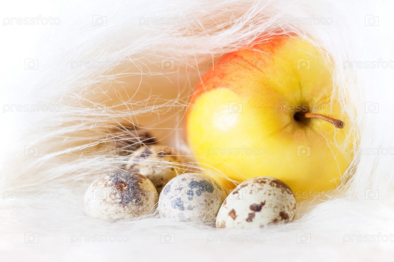 Спелое яблоко и несколько перепелиных яиц, лежащие на белом длинном мехе