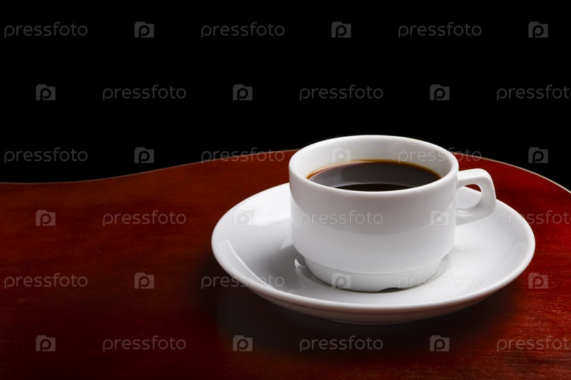 Белая чашка с кофе на темно-коричневом деревянном столе