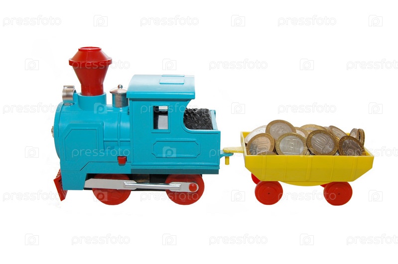 Игрушечный паровоз с тележкой полной монет на белом фоне