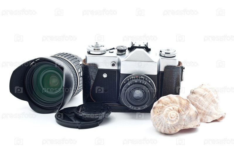 Фотоаппарат, объектив и ракушки на белом фоне