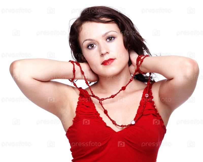 Портрет красивой молодой девушки с красными бусами