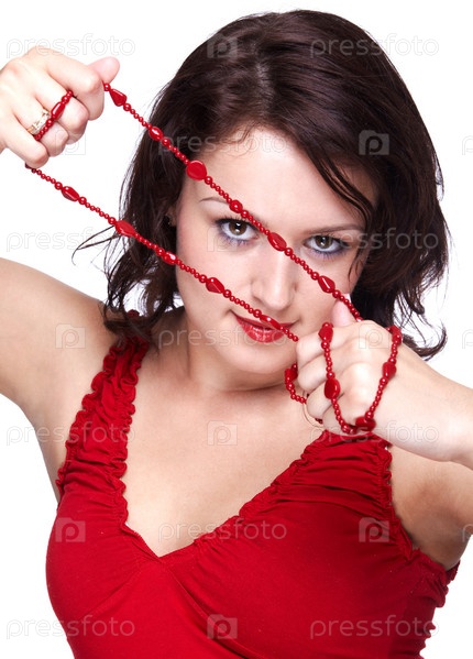 Портрет красивой молодой девушки с красными бусами