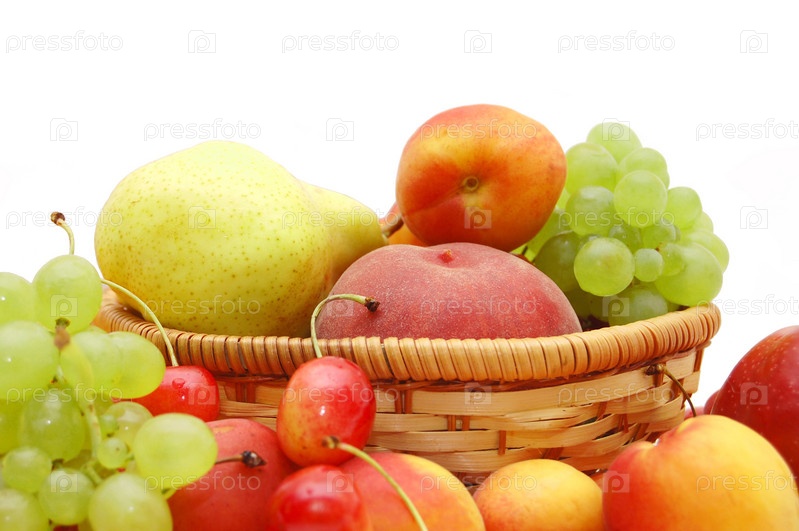 Свежие фрукты в плетеной корзине на белом фоне