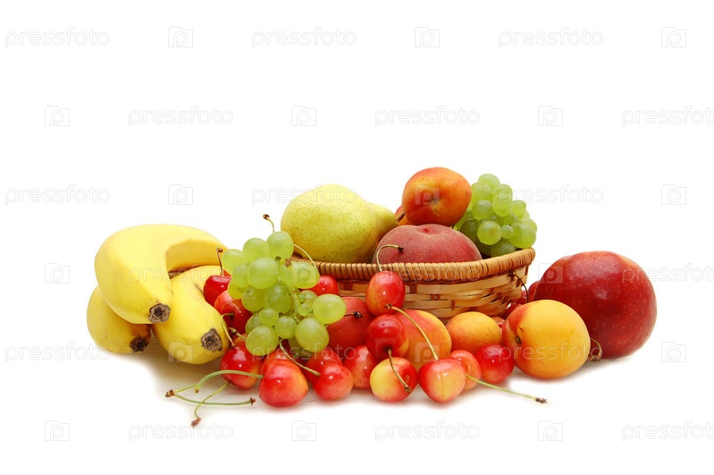 Свежие фрукты в плетеной корзине на белом фоне