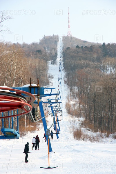 Лыжники едут на подъемнике в гору