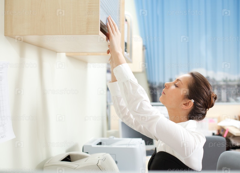 Женщина ищет документы на полке
