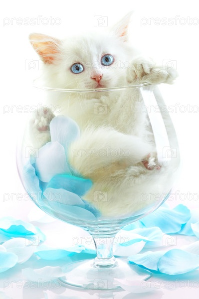 Белый котенок в стеклянном бокале